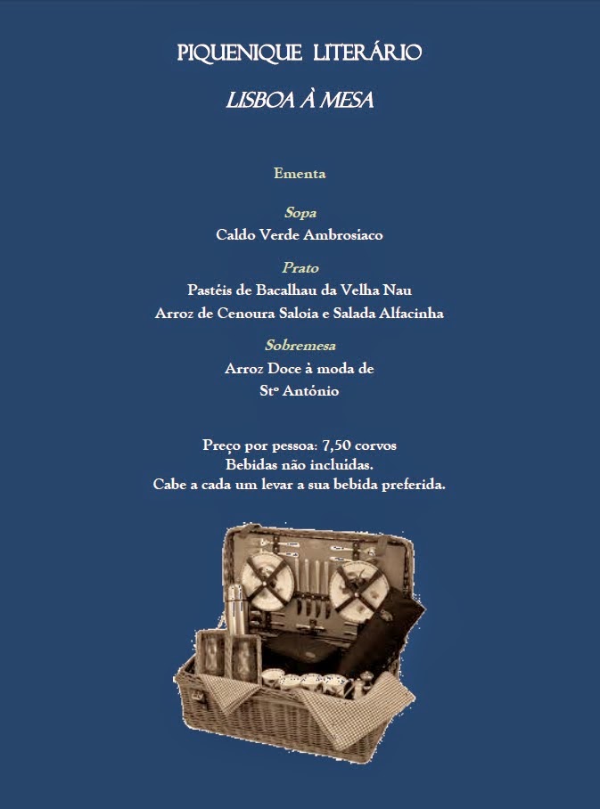 ATENÇÃO: É "obrigatório-aleatório" trazerem uma frase, um poema, um pequeno texto literário, alusivos a Lisboa ou à gastronomia portuguesa, para que o possamos partilhar na hora do piquenique.